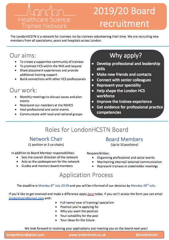 The London HCSTN is a network lead entirely by trainees. Our mission is to support, represent, inform and connect London’s wonderful Trainee Healthcare Scientists. We are currently recruiting board members for the upcoming year. Find out more about what’s involved from our recruitment flyer below.
